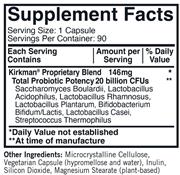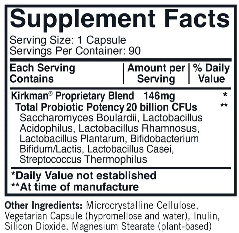 Supports the immune system and gastrointestinal (GI) system health. Includes the probiotic strains in Kirkman’s popular Pro-Bio Gold™ plus Saccharomyces boulardii. Free of common allergens. Gluten and casein free. 90 vegetarian capsules. Ultra Tested®.