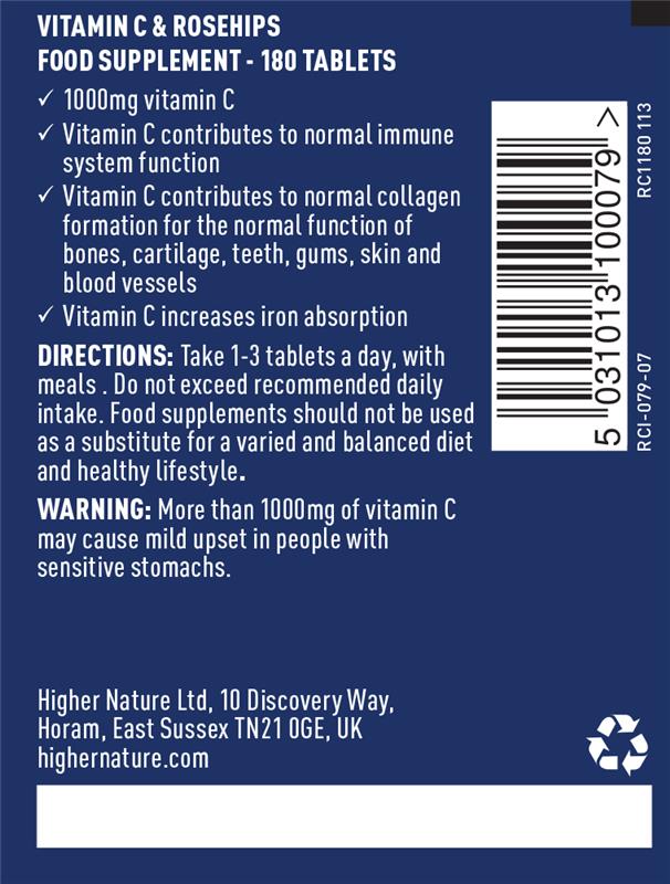 Each tablet provides 1000mg vitamin C combined with naturally powerful rosehip for improved benefits. This essential nutrient is a key requirement for immunity, the body’s production of collagen, cartilage, skin, joints, teeth and gums. It also contributes to energy production.